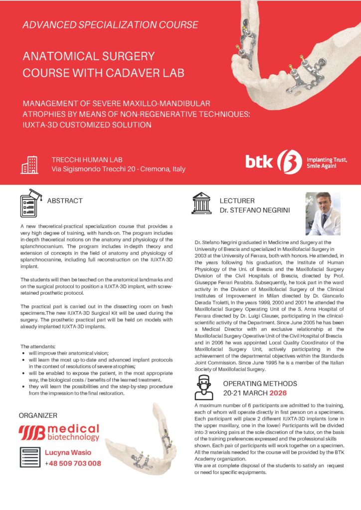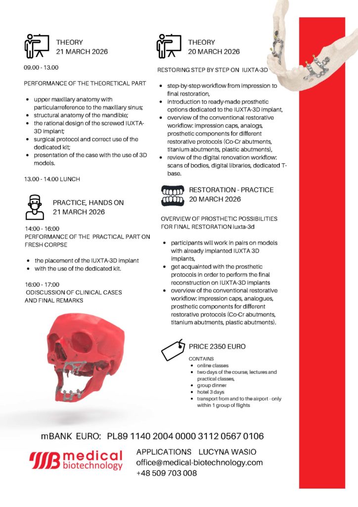 Course on Kadawery 20-21.03.2026Courses Registration for the Kadawery course has begun. Date: March 20-21, 2026 Contact: lucyna@dental-depot.com +48 509 703 008 IUXTA-3D COURSE 03.2026Pobierz